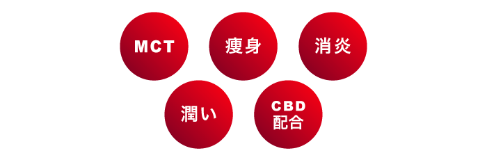 | トリ(カプリル酸/カプリン酸)グリセル、カンナビジオール、アスペルギルス/チャ葉発酵エキス液、パーム油、バニリルブチル、シリカ、トコフェロール、グリチルレチン酸ステアリル、ソルビン酸 |